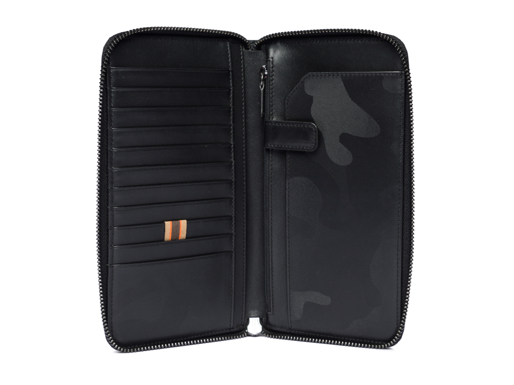 Jedenáct přihrádek na kreditní karty, dvě přihrádky na doklady a jedna kapsa na doklady na zip