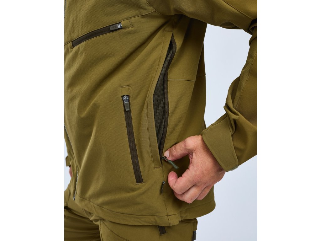 Tato nepodšitá pánská lovecká bunda z plně pružného materiálu je navržena pro aktivní lov, kde je klíčová volnost pohybu a pohodlí. Síťovaná podšívka v oblasti trupu nabízí vynikající prodyšnost, zatímco nepodšité podpaží poskytuje dodatečnou ventilaci. Boční ventilační zipy lze otevřít pro zvýšení proudění vzduchu při vysoké fyzické zátěži. Dvouvrstvá strečová membrána na ramenou a horních rukávech zvyšuje odolnost vůči vodě a celá bunda je opatřena vodoodpudivou impregnací bez PFC.