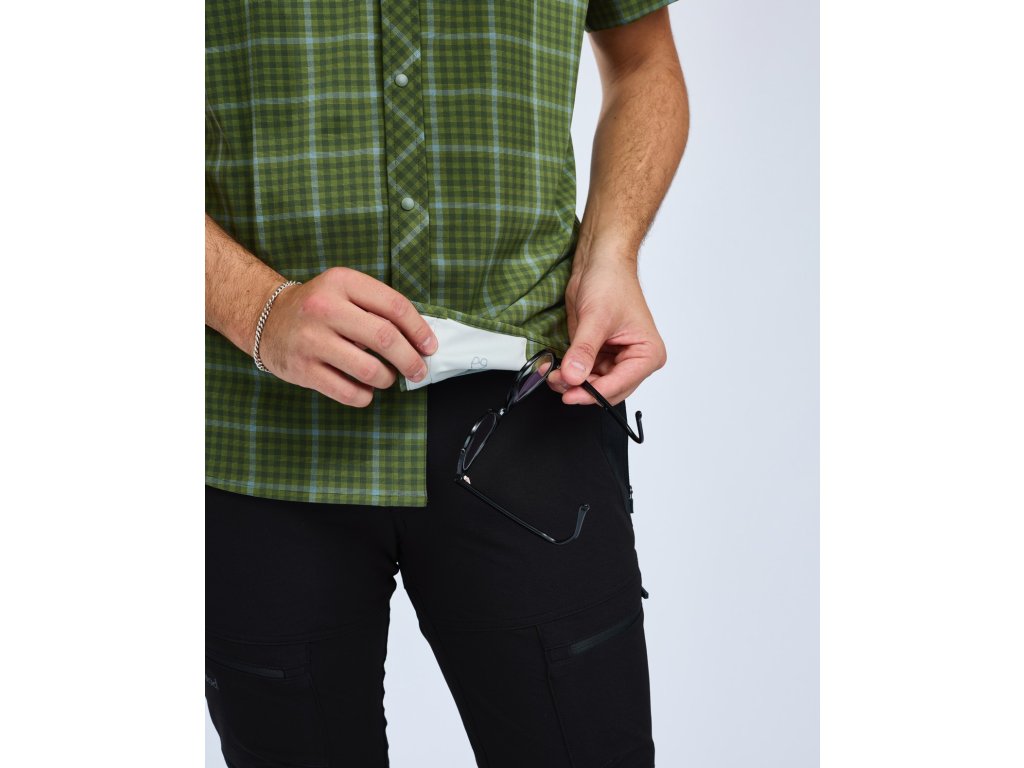 Outdoorová košile pro muže je lehká a vzdušná, vyrobená z vysoce pružného materiálu s přirozenou UV ochranou 50+, kterou zajišťuje hustá tkaná konstrukce. Tkanina je ošetřena technologií HeiQ Fresh pro boj proti nežádoucím zápachům. Košile se snadno zapíná na patentky a obsahuje otevřenou kapsu na hrudi. Uvnitř látky najdete vestavěnou utěrku na brýle, ideální pro rychlé čištění brýlí nebo slunečních brýlí. Materiál odvádí vlhkost a rychle schne, což vás udrží svěží během teplých dnů a náročných aktivit.