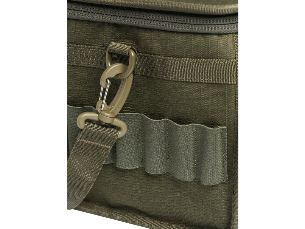 Taška na náboje s kapacitou až 6 krabiček po 25 nábojích, se 3 vnějšími kapsami na čoky, čepice a další příslušenství.